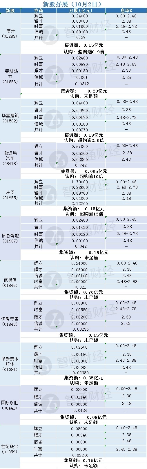 截至10月2日,耀才、辉立、时富、信诚分别为其借出0.29亿元、0.0342亿元、0.6927亿元、0.742亿元、2.123亿元、0.042亿元、0.321亿元。其中高升、华营建筑、傲迪玛汽车、庄臣分别超购0.9倍、2.6倍、10倍、13倍。其他认购尚未足额。