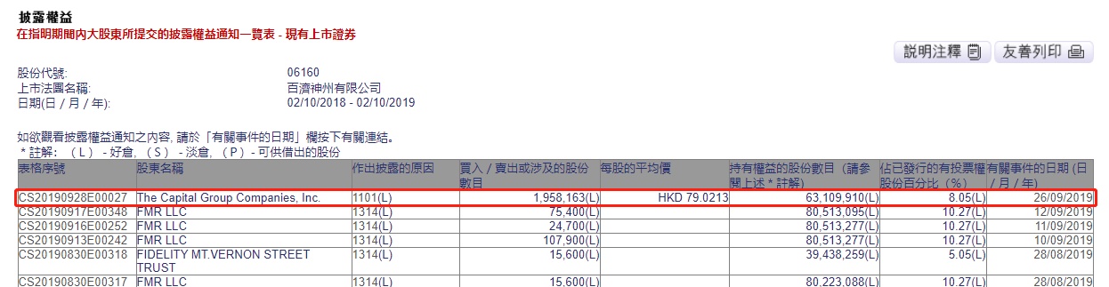 智通财经APP获悉,联交所最新资料显示,9月26日,美国资本集团增持百济神州(06160)195.82万股,每股作价79.0213港元,涉及总金额约为1.55亿港元。增持后最新持股数目约为1.67亿股,最新持股比例为8.05%。