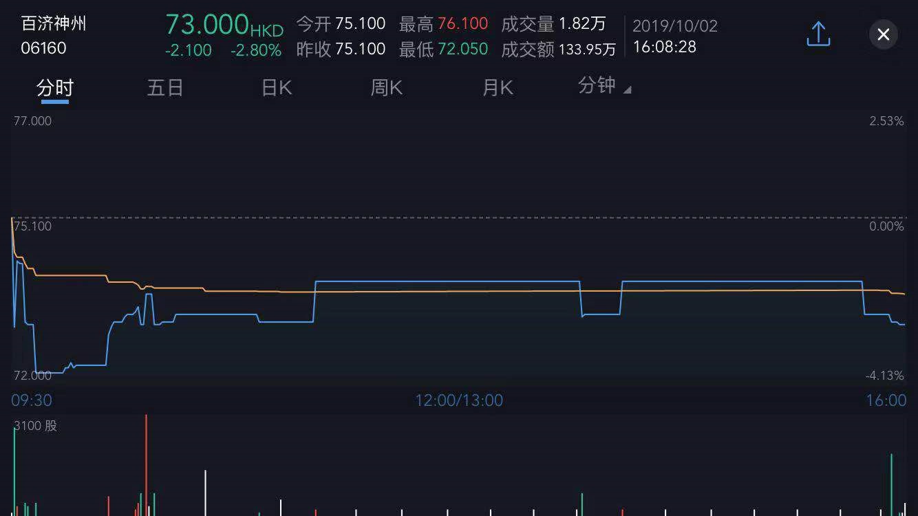 截至今日收盘,百济神州(06160)跌2.8%,报73港元。