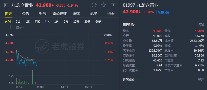 该行指出,由于香港零售销售疲弱,同时九龙仓置业市盈率过去一直跟随香港零售销售按年趋势表现,预测未来12个月市盈率为12.7倍,股息回报率5%,并较净资产值折让47%,但若零售租金下跌,净资产值有下行风险。