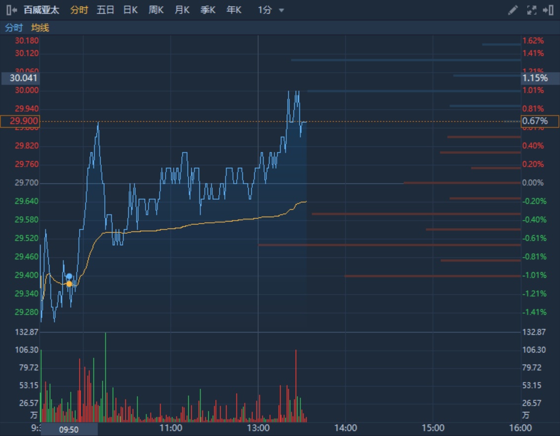 智通财经APP获悉,次新股百威亚太(01876)午后一度突破30港元大关,市值超4000亿港元。截至13时32分,涨0.67%,报价29.9港元,成交额11.11亿。