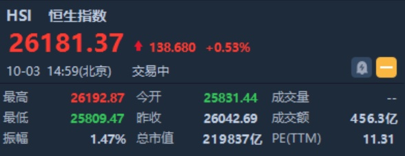 智通财经APP获悉,恒生指数午后快速反弹,由跌转涨,涨幅超100点,截至14时59分,涨0.53%,报价26181.37点,成交额456.3亿。