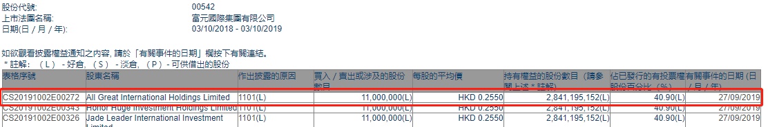 智通财经APP获悉,联交所最新资料显示,9月27日,All Great International Holdings Limited增持富元国际(00542)1100万股,每股作价0.255港元,涉及总金额约为280.5万港元。增持后最新持股数目约为28.4亿股,最新持股比例为40.9%。