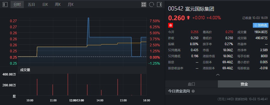 截至今日收盘,富元国际(00542)涨4%,报0.26港元。