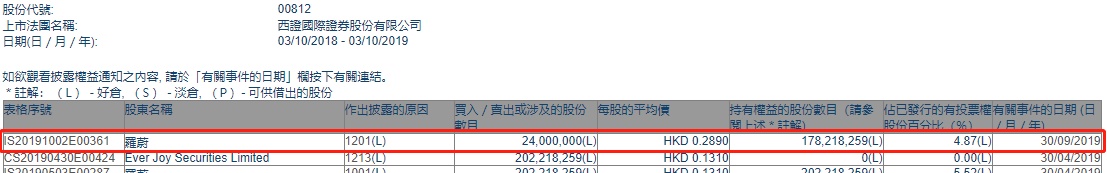 智通财经APP获悉,联交所最新资料显示,9月30日,股东罗蔚减持西证国际证券(00812)2400万股,每股作价0.289港元,涉及总金额约为693.6万港元。减持后最新持股数目约为1.78亿股,最新持股比例为4.87%。
