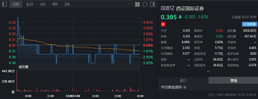 截至今日收盘,西证国际证券(00812)跌1.61%,报0.305港元。