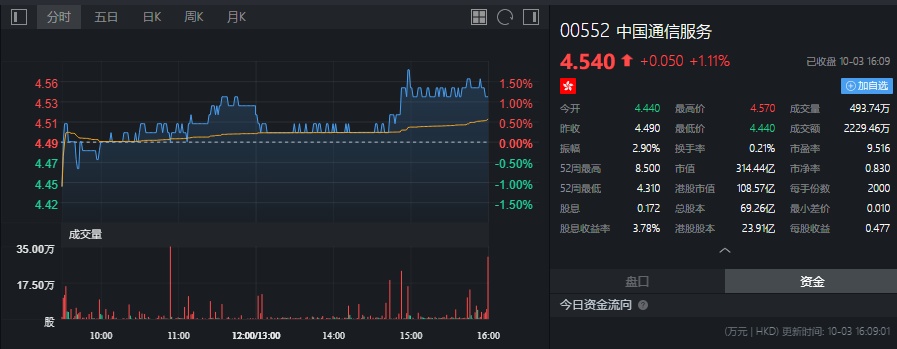 截至今日收盘,中国通信服务(00552)涨1.11%,报4.54港元。