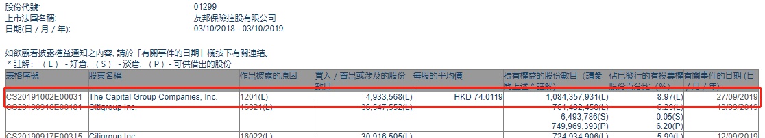 智通财经APP获悉,联交所最新资料显示,9月27日,美国资本集团减持友邦保险(01299)493.36万股,每股作价74.0119港元,涉及总金额约为3.65亿港元。减持后最新持股数目约为10.84亿股,最新持股比例为8.97%。