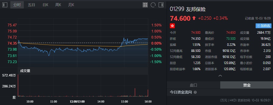 截至今日收盘,友邦保险(01299)涨0.34%,报74.6港元。