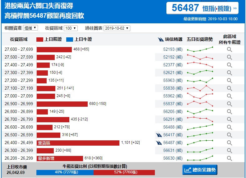 智通财经APP获悉,截至10月4日,恒指最新的牛熊街货比例48:52。瑞信恒指牛熊证街货分布图中的数据显示,熊证街货重货区在26400-26499区间,该区间最新熊证数量为1101张,较上一交易日增加32张,最多新增在26208-26299区间,较上一交易日增加360张。牛证街货重货区在25000-25099区间,该区间最新牛证数量为927张,比上一交易日增加26张;最多新增在25500-25599区间,较上一交易日增加214张。