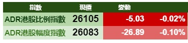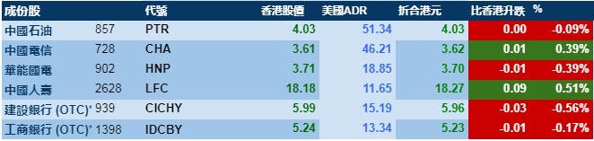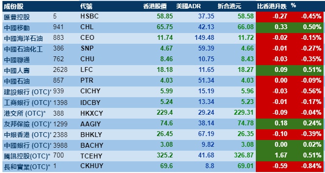 智通财经APP获悉,周四(10月3日)市场消化经济数据利空,美联储降息概率上涨,美股急跌转升,港股ADR指数录得轻微跌幅,按比例计算,收报26105点,跌5点或0.02%。大型蓝筹涨跌不一,汇丰控股收报58.58元,较港收市跌0.27元;腾讯控股收报326.87元,较港收市涨1.67元。