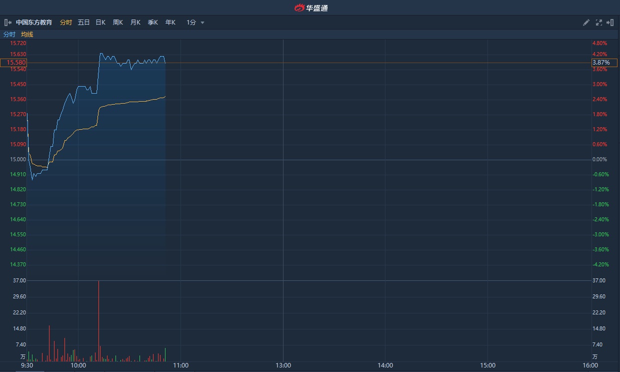 智通财经APP获悉,中国东方教育(00667)早盘逆市拉升逾4%,盘中高见15.66港元,刷新上市以来新高。截止发稿,涨4%,报15.6港元,成交额2933.89万港元。
