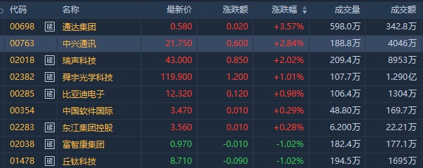 截止发稿,中兴通讯(00763)涨2.84%,报21.75港元;瑞声科技(02018)涨2.14%,报43.05港元;比亚迪电子(00285)涨1.31%,报12.36港元;舜宇光学(02382)涨0.67%,报119.5港元。