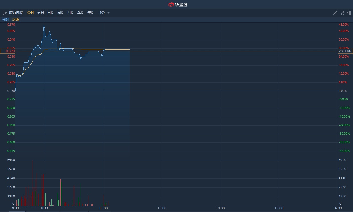 智通财经APP获悉,应力控股(02663)公布,预期上半年正常经营业务所取得的综合除税后纯利同比增加不少于60%。股价盘中一度涨逾46%。截止发稿,涨28%,报0.32港元,成交额301.57万港元。