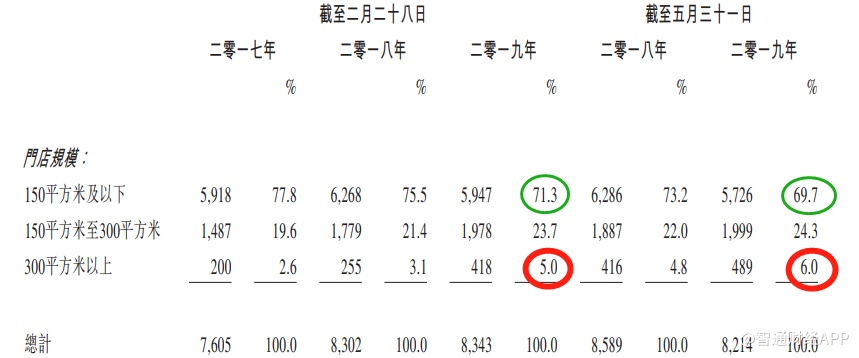 2019财年时,150平方米及以下的门店数量占比为71.3%,同比下降4.2个百分点,但150平方米至300平方米、以及300平方米以上门店的占比均有所提升,且提升的值明显大于2018财年。与此同时,截至2019年5月31日时,该趋势仍在继续保持。