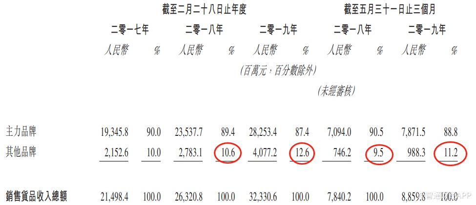 智通财经APP发现,在2019财年以及2020财年第一季度中,主品牌收入占比相较上一年有明显回落,而其他品牌的收入占比则有明显提升。2019财年时,其他品牌的收入占比为12.6%,提升2个百分点,2020财年第一季度时,其他品牌的收入占比为11.2%,提升1.7个百分点。