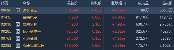 截止发稿,瑞声科技涨5.46%,报44.45港元;高伟电子(01415)涨5%,报1.26港元;通达集团(00698)涨3.57%,报0.58港元;比亚迪电子(00285)涨2.13%,报12.46港元。
