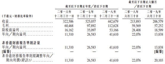 截至2018年三个财政年度及截至2019年6月30日止六个月,公司的收益分别是322.5百万港元、525.1百万港元、442.7百万港元和206.6百万港元。截至2017年及2018年12月31日止年度,收益减少乃主要由于硅胶音频组件的收益减少约106.5百万港元。该减少主要归因于向公司客户B销售脖戴式耳机线的硅胶组件的销量减少所致。