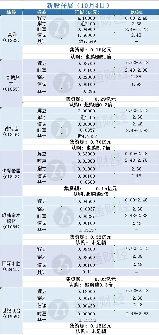 截至10月4日,高升超购逾51倍,德视佳超购逾5.7倍,快餐帝国超购逾3倍,永胜国际超购逾0.3倍,春城热力超购逾0.2倍,只有绿新亲水胶体和世纪联合认购尚未足额。