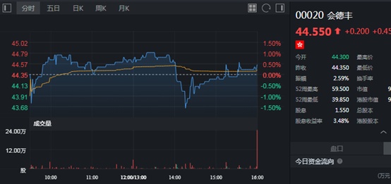 截至今日收盘,会德丰涨0.45%,报44.55港元。
