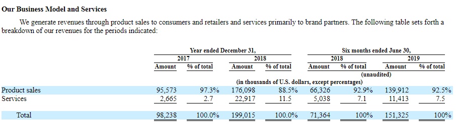 易恒健康的第二个收入来源是服务,主要通过获取用户数据,再利用数据为品牌商提供营销解决方案。该业务2018年收入2292万美元,同比增长760%。