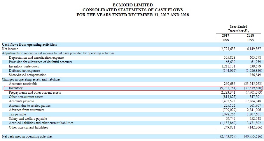 可见,易恒健康虽然有生态化的发展战略,不过依旧是个垂直电商。而电商最大的资产一般是存货,易恒健康也是如此。2018年其存货为5368万美金,占总资产45.6%。占比这么大,说明公司很多资金压在存货里,现金流就不一定好。易恒健康2018年净利润615万美元,但是经营活动现金流净额为-4076万美元,主要是因为存货占用了3764万美元的现金流。