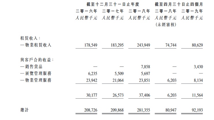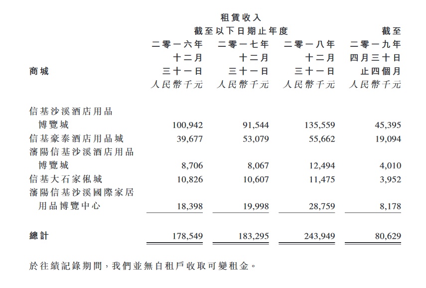 信基沙溪集团收益主要由物业租赁收入、销售货品、展览服务和物业管理服务,其中物业租赁收入占比重最高。截至二零一六年、二零一七年及二零一八年十二月三十一日止年度以及截至二零一九年四月三十日止四个月,公司的租金收入分别约为人民币178.5百万元、人民币183.3百万元、人民币243.9百万元及人民币80.6百万元,分别占总收入约85.5%、87.3%、86.7%及87.5%。