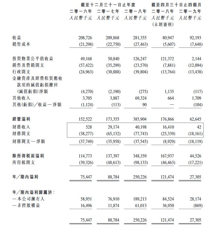 财务数据显示,截至二零一六年、二零一七年及二零一八年十二月三十一日止三个年度以及截至二零一九年四月三十日止四个月,该公司的收益分别约为人民币208.7百万元、人民币209.9百万元、人民币281.4百万元及人民币92.2百万元。