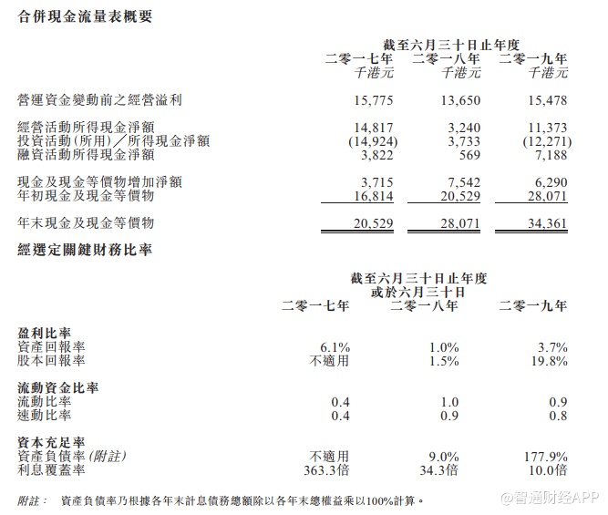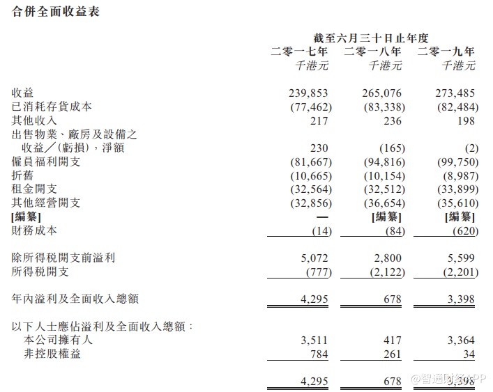 截至二零一七年、二零一八年及二零一九年六月三十日止年度,集团收益分别为 约239.9百万港元、265.1百万港元及273.5百万港元。