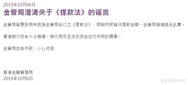 智通财经APP获悉,10月6日,香港金管局发布声明称,留意到有传言称金管局会订立《提款法》,限制市民每日提款金额。金管局强调绝无此事,并忠告市民小心流言。