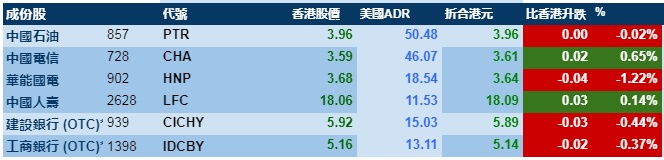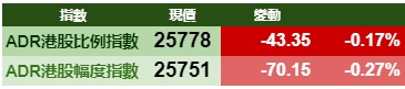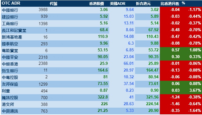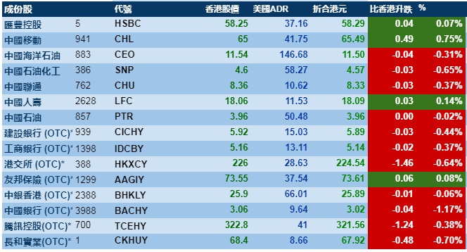 智通财经APP获悉,周一(10月7日)美股震荡小跌,结束连续两日的反弹行情,港股ADR指数小幅下跌,按比例计算,收报25778点,跌43.35点或0.17%。大型蓝筹涨跌不一,汇丰控股收报58.29元,较港收市涨0.04元;腾讯控股收报321.56元,较港收市跌1.24元。