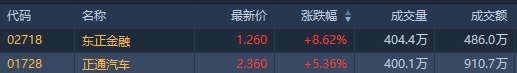 截至发稿,正通汽车涨3.57%,报2.32港元,成交额861.01万港元;东正金融涨7.76%,报1.25港元,成交额484.03万港元。