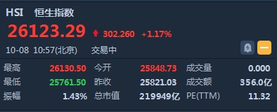 智通财经APP获悉,恒生指数今日高开高走,涨幅持续扩大,现升逾300点,截至10时57分,涨302.26点或1.17%,报价26123.29点,成交额暂为345亿。