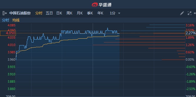 智通财经APP获悉,中石油(00857)获大和看高至5.75港元,评级由“跑赢大市”升至“买入”。截至13时51分,涨2.53%,报价4.06港元,成交额2.258亿。