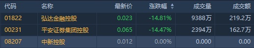 ”先锋系“普跌。截至发稿,弘达金融控股(01822)跌14.81%,报0.023港元;平安证券集团控股(00231)跌11.84%,报0.067港元;中新控股于2019年7月8日上午9点起暂停交易,至今仍未复牌。