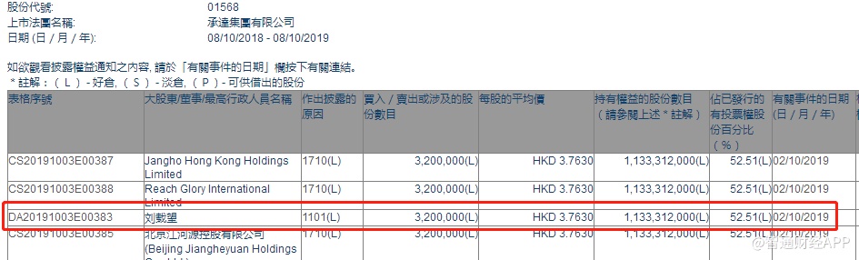 智通财经APP获悉,联交所最新资料显示,10月2日,主席刘载望增持承达集团(01568)320万股,每股作价3.7630港元,总金额为1204.16万港元。增持后最新持股数目约为11.33亿股,最新持股比例为52.51%。