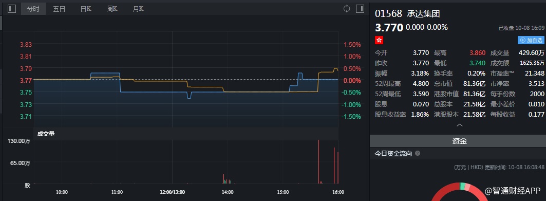 截至今日收盘,承达集团(01568)无涨跌,报3.77港元。