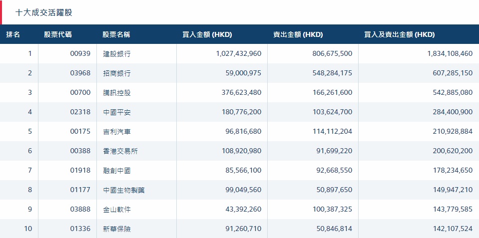 建设银行(00939)全天获净买入2.2亿港元。此外,北水主要沽售中兴通讯(00763)、舜宇光学(02382),净卖出额分别为2549万、3490万港元。