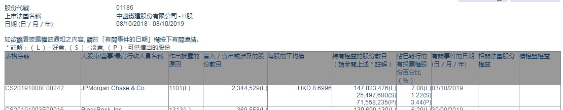智通财经APP获悉,联交所最新资料显示,10月3日,摩根大通增持中国铁建(01186)234.45万股,每股作价8.69港元,总金额约为2037.37万港元。增持后最新持股数目约为1.47亿股,最新持股比例为7.08%。
