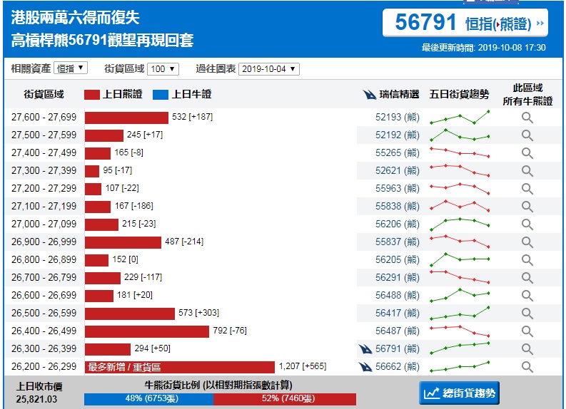 智通财经APP获悉,截至10月9日,恒指最新的牛熊街货比例48:52。瑞信恒指牛熊证街货分布图中的数据显示,熊证街货重货区和最多新增都在26200-26299区间,该区间最新熊证数量为1207张,较上一交易日增加565张。牛证街货重货区在25000-25099区间,该区间最新牛证数量为780张,比上一交易日减少77张;最多新增在24800-24899区间,较上一交易日增加53张。
