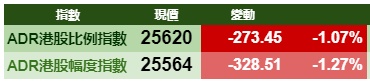 智通财经APP获悉,周二(10月8日)美股低开低走,午市之后跌幅缩窄,但在鲍威尔讲话后三大股指急跌,收盘均跌逾1%。港股ADR指数受美股拖累大跌,按比例计算,收报25620点,跌273.45点或1.07%。大型蓝筹受挫,汇丰控股收报57.55元,较港收市跌0.9元;腾讯控股收报318.96元,较港收市跌4.84元。