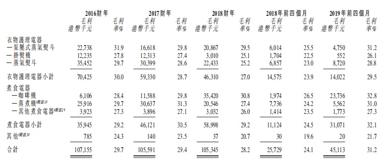 公司在2016财年、2017财年、2018财年及2019年前四个月,衣物护理电器销售的收益分别为2.346亿港元、2.070亿港元、1.716亿港元及4760万港元,相当于相应期间总收益的65.0%、57.7%、45.9%及32.9%。于2016财年、2017财年、2018财年及2019年前四个月,煮食电器销售的收益分别为1.232亿港元、1.512亿港元、2.017亿港元及9690万港元,相当于相应期间总收益的34.1%、42.1%、54.0%及67.0%。于往绩记录期间,该增长归因于咖啡机销售量大幅增加,而这主要是因为推出的几款新型全自动咖啡机备受客户认可。