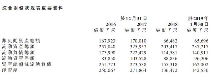于2016年12月31日、2017年12月31日、2018年12月31日及2019年4月30日,流动资产净额约8390万港元、1.035亿港元、8880万港元及9630万港元。净资产由2017年12月31日的约2.719亿港元减少至2018年12月31日的约1.365亿港元,主要由于因重组而将相关资产作为视作分派给Tunbow Investments(受公司控股股东所控制),包含东保(惠州)于2018年12月31日未转让、出让或变更予登辉(惠州)的资产及负债,主要包括东保(惠州)所持有的土地及厂房。
