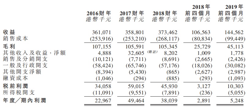 公司收益由2016财年约3.611亿港元增加至2018财年约3.735亿港元,由2018年前四个月约1.066亿港元增加至2019年前四个月约1.446亿港元,且税后溢利由2016财年约2300万港元增加至2018财年约3800万港元,由2018年前四个月约290万港元增加至2019年前四个月约520万港元。