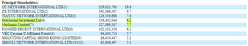 在公司主要股东当中,段毅为公司第一大股东,持股比例为19.8%;曾熙为第二大股东,持股比例为9.7%;Greyhound Investment Ltd.为第三大股东,持有136,402,044股普通股,持股比例为8.2%;李建成为第四大股东,持股比例为7.8%;Merlinano Limited为第五大股东,持有127,089,187股普通股,持股比例为7.7%。