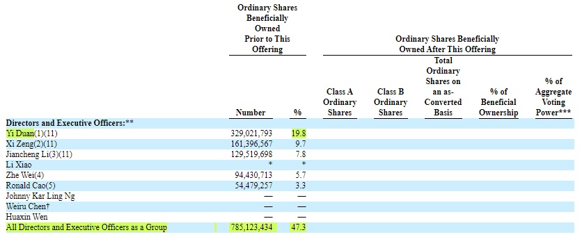 在首次公开募股之前,房多多的董事和高管合计持有公司785,123,434股普通股,占总股本的47.3%。其中,房多多董事会主席兼首席执行官段毅持有329,021,793股普通股,占总股本的19.8%;董事兼首席运营官曾熙持有161,396,567股普通股,占总股本的9.7%;董事兼首席技术官李建成持有129,519,698股普通股,占总股本的7.8%。