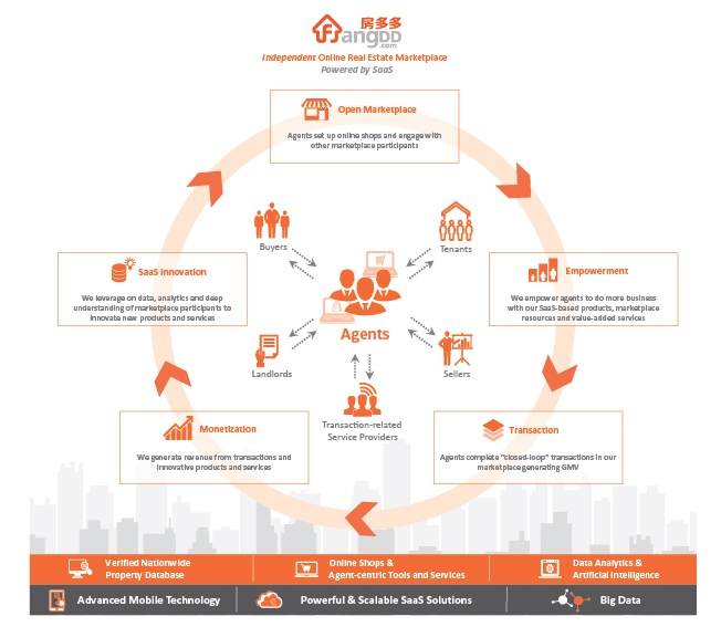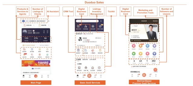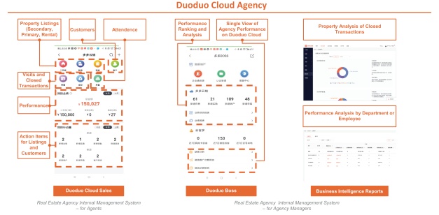 手机APP包括“Duoduo Sales”,为房地产经纪人提供产品以及服务;“Duoduo Cloud Agency”,提供机构业务管理功能;以及“Fangduoduo”,为房地产买家和卖家提供相关的产品以及服务。