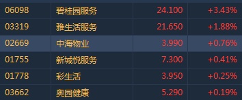 智通财经APP获悉,物业管理股获瑞银唱好,今日该板块整体上涨。截至11时12分,碧桂园服务(06098)涨3.43%,雅生活服务(03319)涨1.88%,新城悦服务(01755)涨0.41%,彩生活(01778)涨0.25%。