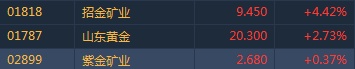 智通财经APP获悉,COMEX期金突破1510美元关口,黄金股随A股集体上涨。截至13时35分,招金矿业(01818)涨4.42%,报价9.45港元,山东黄金(01787)涨2.73%,紫金矿业(02899)涨0.37%。