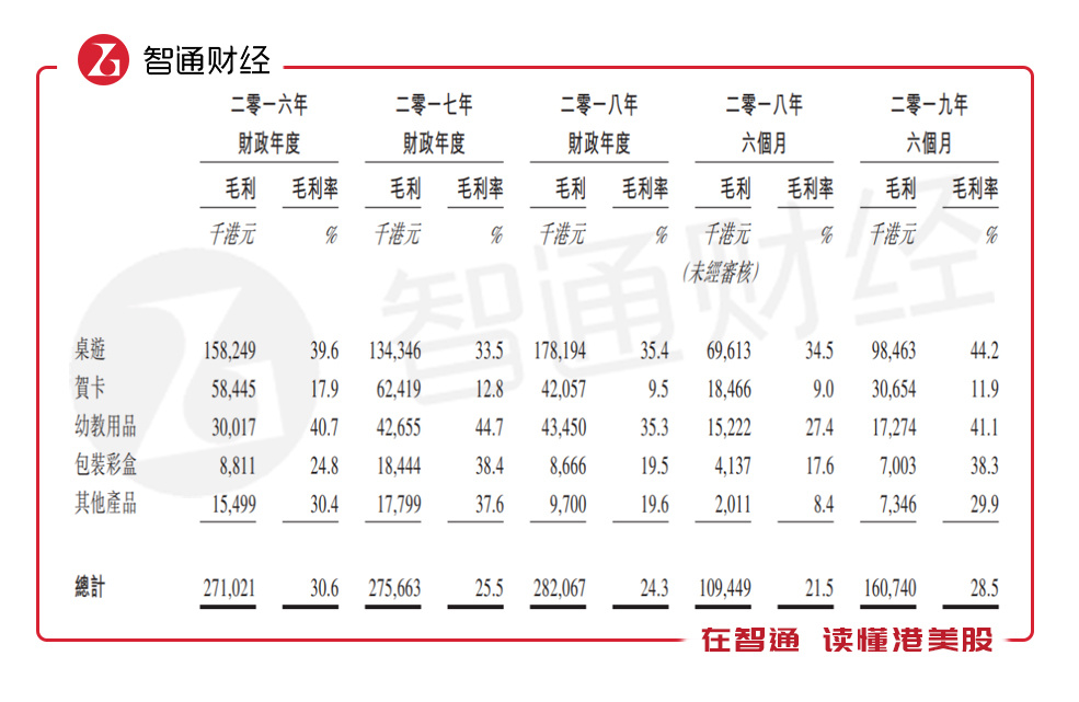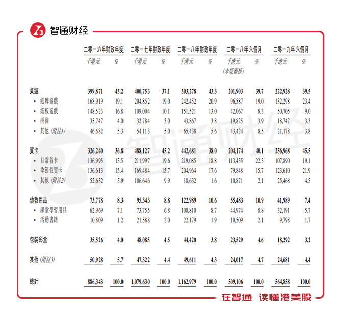 隽思提供的产品包括桌游卡片(纸牌游戏、纸板游戏及拼图)、贺卡(日常贺卡及季节性贺卡)、幼教产品(课堂学习用具及活动书籍)以及包装彩盒,核心产品主要为桌游及贺卡,这两项产品往年收入贡献基本都超过了80%。近三年,桌游、贺卡、幼教产品及包装彩盒收入复合增长率分别为12.16%、16.5%、29.1%及11.8%。